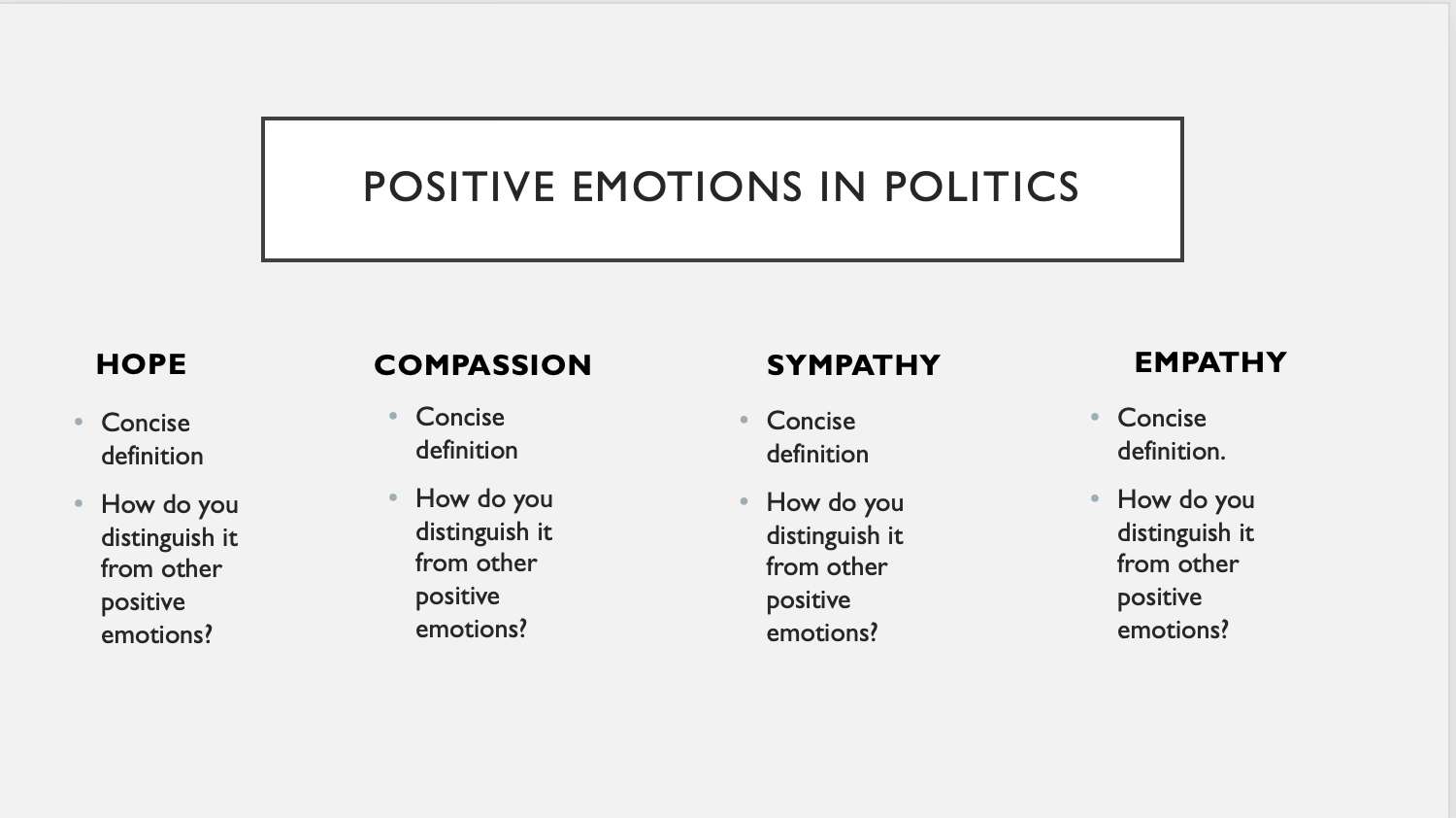 To start, I asked students to write down the four emotions we had discussed the preceding two weeks: hope, compassion, empathy, and sympathy.